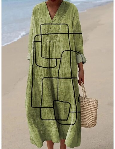 Naisten midi-mekko V-kaula-aukko pitkähiha kaftaani kevyt löysä istuvuus A-linjainen mekko rento päivittäin graafinen geometrinen pitkähiha V-kaula-aukko laivastonsininen keltainen vihreä beige syksy