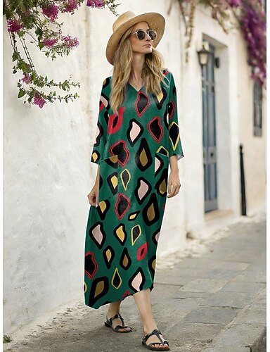 Naisten Maksimekko Kesämekko A linjainen mekko Loma Vapaa-aika Boheemi Hiekkaranta Bile Loose Fit Kukka Kuvitettu Geometrinen Pitkähihainen V kaula-aukko Kuninkaallinen sininen Apila Khaki Beesi Kes