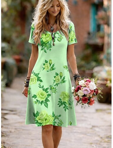 episodinen piirros naisten minimekko kesämekko t-paitamekko t-mekko loma rento biletys normaali istuvuus kukkakuvio lyhythihainen v-aukkoinen vihreä kesä kevät syksy