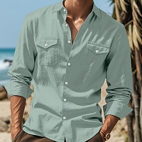 Miesten Paita Pellava paita Kesä paita Ranta-asut Button Up paita Avoimet paidat Yhtenäinen väri Loma Katu Valkoinen Sininen Apila Khaki Pitkähihainen Kaulus Vaatetus Tasku
