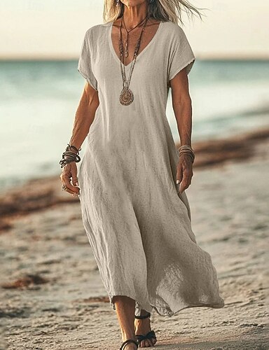 Naisten midi-mekko kesämekko rento päivittäinen lomaranta säännöllinen istuvuus pellavamaista yksinkertainen lyhythihainen V-kaula-aukkoinen valkoinen vaaleanpunainen sininen vihreä kesä