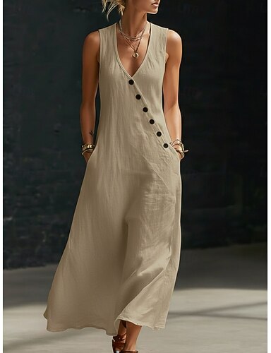 Naisten Maksimekko Keinopuuvillainen pellava A linjainen mekko Kesämekko Vapaa-aika Päivittäin Normaali Tavallinen Hihaton V kaula-aukko Musta Valkoinen Keltainen Viini Kesä Kevät Syksy