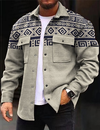 Miesten Tribaali Geometria Etninen Paita Paidan takki Päällyspaita Pitkähihainen Vintage Vapaa-aika Viidakko ulko- Katu Rento / arki Syystalvi Sänkyjen avaus Napit Tasku Painettu Sininen Ruskea Harmaa