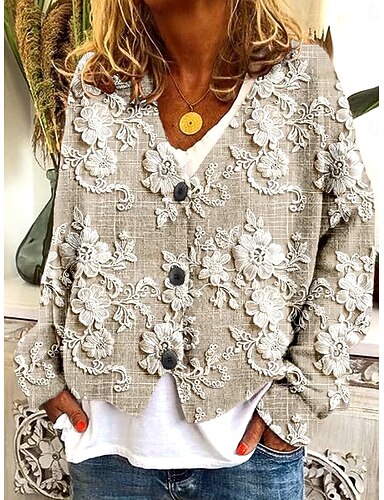 Naisten Neulos Neule Tyylikäs Vintage Muoti Kukka Kuvitettu V kaula-aukko Tasku Kudottu Painettu Pitkähihainen Tavalliset topit Neuloa ulko- Päivittäin Viikonloppu Rubiini Fuksia Syksy Talvi