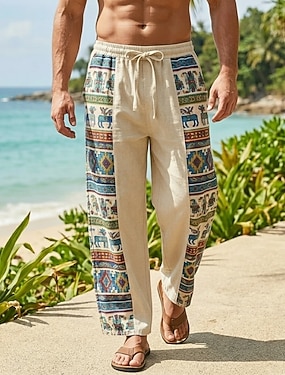 Miesten Pellavahousut Housut Kesähousut Roikkuvat housut Rantahousut Kurenauha Joustava vyötärö Painettu Etninen Mukavuus Hengittävä Täyspitkä Päivittäin ulko- Hiekkaranta Muoti Boheemi Sininen Musta