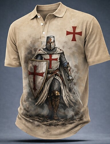 Miesten ristiretkeläisten polvistuva ritari temppeliherrain keskiaikainen vintage T-paita all over print nauhalla V-kaula-aukko kunnioituksen soturi lyhyet hihat yläosa retro katumuoti muotimerkin