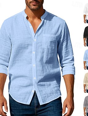 Miesten pellava paita Rento paita Button Up paita Tavallinen Loma Katu Musta Valkoinen Tumma laivastonsininen Beesi Pitkähihainen isoisän kaulus Kevät kesä Vaatetus Tasku
