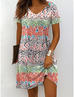 Naisten Mini mekko Tpaitamekko Kesämekko A linjainen mekko Loma Vapaa-aika Rantatyyliä Bile Hiekkaranta Normaali istuvuus Kukka Kuvitettu Lyhythihainen V kaula-aukko Syvä vihreä Punainen musta