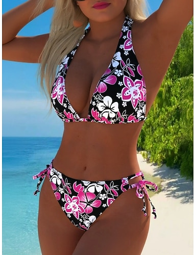 Naisten Uima-asut Bikinit 2 kpl Uimapuku Avoin selkä Trooppinen Ranta-asut Tavallinen Kukka Riipuskaula Hihaton Uimapuvut