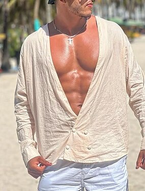 Miesten Paita Pellava paita Kesä paita Ranta-asut Rantapaita Yhtenäinen väri Loma Pyhäpäivä Beesi Pitkähihainen V kaula-aukko Kesä Kevät Vaatetus