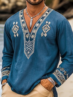 Miesten Paita Popover paita Kesä paita Rantapaita Tilkkutäkki Loma Pyhäpäivä Sininen Pitkähihainen Kaulukseton Kesä Kevät Vaatetus Entninen ja uskoinnollinen