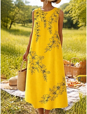 Naisten Midimekko Väljä mekko Kesämekko A linjainen mekko Loma Vapaa-aika Boheemi Hiekkaranta Juhla Normaali Kukka Kuvitettu Hihaton Tiukka pyöreä kaula-aukko Keltainen Punastuvan vaaleanpunainen