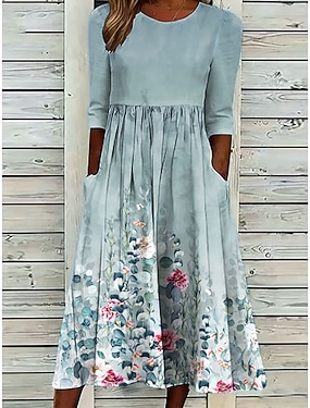 Naisten Midimekko Kesämekko Loma Vapaa-aika Boheemi Hiekkaranta Pyhäpäivä Loose Fit Kukka Kuvitettu 3/4 hiha Tiukka pyöreä kaula-aukko Sininen Valkoinen Punastuvan vaaleanpunainen Kesä Kevät