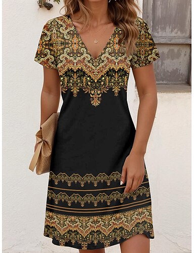 Naisten Mini mekko Kesämekko Tpaitamekko Loma Vapaa-aika Boheemi Bile Normaali Kuvitettu Paisley-kuvio Lyhythihainen V kaula-aukko Musta kulta Saarni Musta Rubiini Kesä Kevät