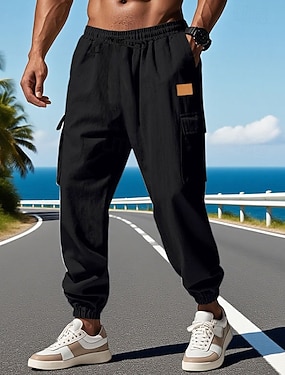 Miesten Reisitaskuhousut Pellavahousut Kesähousut Kurenauha Joustava vyötärö Suora jalka Tavallinen Mukavuus Hengittävä Täyspitkä Kausaliteetti Päivittäin Hiekkaranta Loma Muoti Sininen Musta