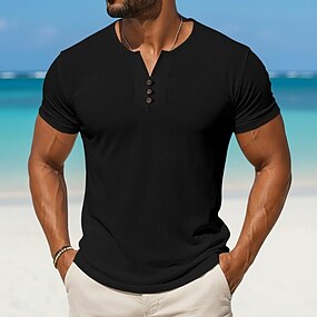 Miesten Henley-paita Puuvillainen pellava T-paita T-paita Lyhythihainen V kaula-aukko Kesä Yhtenäinen väri Muoti Suunnittelija Vapaa-aika Napit Kausaliteetti Päivittäin ulko- Musta Valkoinen