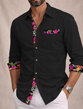 Miesten Paita Pellava paita Kesä paita Ranta-asut Button Up paita Kukka Kausaliteetti Päivittäin Sininen Musta Valkoinen Punastuvan vaaleanpunainen Pitkähihainen Kauluskäänne Kesä Kevät Vaatetus