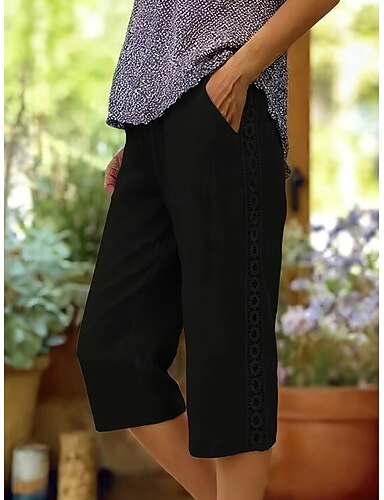 Naisten Caprihousut Keinopuuvillainen pellava Kesähousut Housut Katutyyli Vapaa-aika Polven pituus Keskikorkea vyötärö Yhtenäinen väri Tasku Mukava Hengittävä Joustamaton Päivittäin ulko- Loma Musta