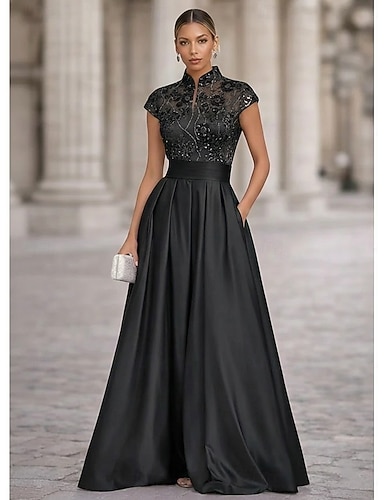 A-linja Kokopitkä Iltapuku Tyylikäs Kimalteleva Kimaltava Lyhythihainen poolokaulus Iltajuhlat Häät Tasku Satiini Tylli kanssa Laskokset Helmillä koristeltu