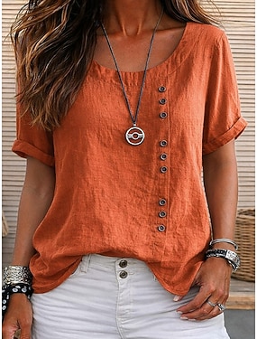 Naisten Paita Cotton Blend Pusero Napit Tavallinen Perus Moderni Lyhythihainen Tiukka pyöreä kaula-aukko Tavalliset topit Päivittäin Pyhäpäivä Sininen Valkoinen Punastuvan vaaleanpunainen Oranssi