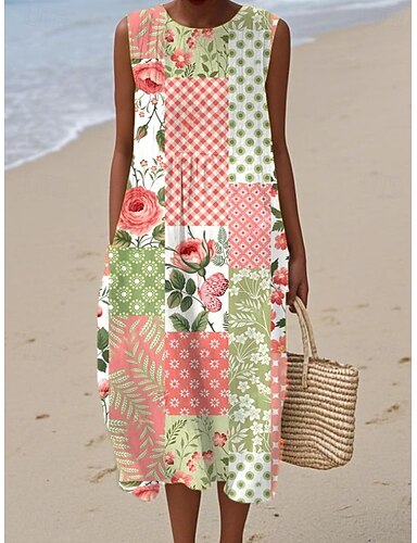 Naisten midi-mekko pellavamaista kangasta kesämekko A-linjainen mekko lomailu rento boho ranta juhliin väljähkö kukkakuvio hihaton pyöreä pääntie valkoinen vaaleanvihreä vaaleanpunainen oranssi kesä