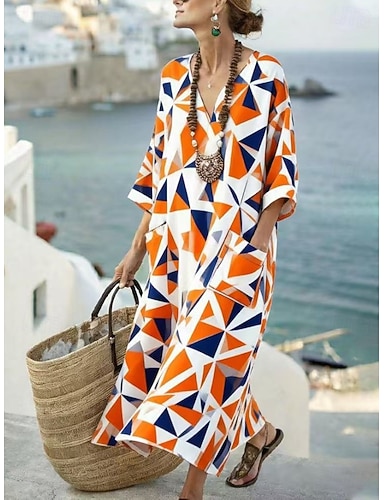 Naisten maksimekko pellavan kaltainen hengittävä kevyt a-linjainen mekko lomamatka rento boho-ranta reilu istuvuus graafinen geometrinen 3/4-hihainen V-kaula-aukko sininen vaaleanpunainen punainen