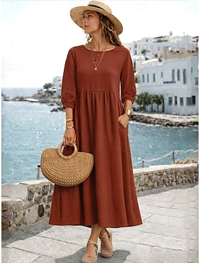 Naisten Midimekko Keinopuuvillainen pellava A linjainen mekko Vapaa-aika Päivittäin Normaali Tavallinen 3/4 hiha Tiukka pyöreä kaula-aukko Sininen Valkoinen Vaalean vihreä Punastuvan vaaleanpunainen