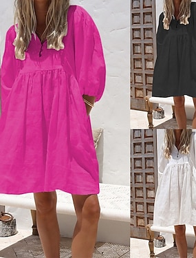 Naisten Mini mekko Puuvillaiset pellavamekot Puuvillapellavamekko Muoti Klassinen Puhvihiha ulko- Päivittäin Pyhäpäivä Normaali Tavallinen Pitkähihainen V kaula-aukko Musta Valkoinen Ruusun punainen