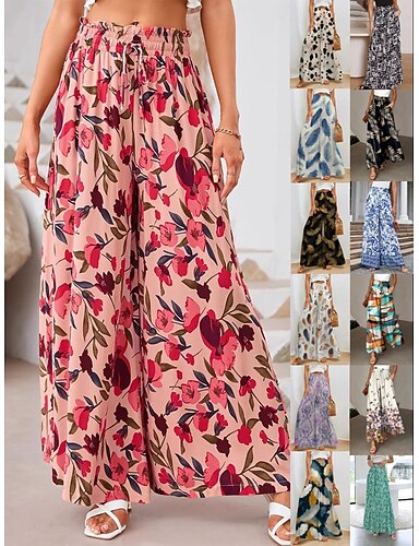 Naisten Leveä reisi Boho housut Kiinalainen Loma Katutyyli Vapaa-aika Täyspitkä Keskikorkea vyötärö Kukka Kuvitettu Kurenauha Tasku Joustava vyötärö Mukavuus Hengittävä Mikrojoustava Päivittäin ulko