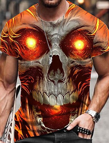 Miesten 3D Print Helvetin liekit 3D Luuranko T-paita Lyhythihainen T-paita 3D-tulostus Tiukka pyöreä kaula-aukko Paita Liioiteltu Suunnittelija Kauhu Juhla Katu Pyhäpäivä Oranssi 3 Oranssi Oranssi 2