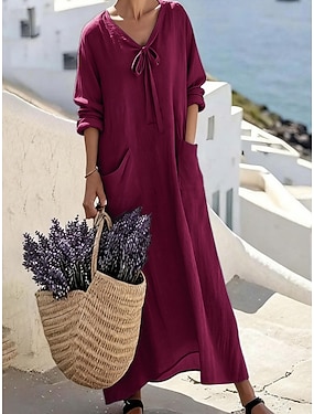 Naisten Maksimekko Keinopuuvillainen pellava A linjainen mekko Vapaa-aika Päivittäin Normaali Tavallinen Pitkähihainen V kaula-aukko Sininen Musta Keltainen Rubiini Kesä Kevät Syksy
