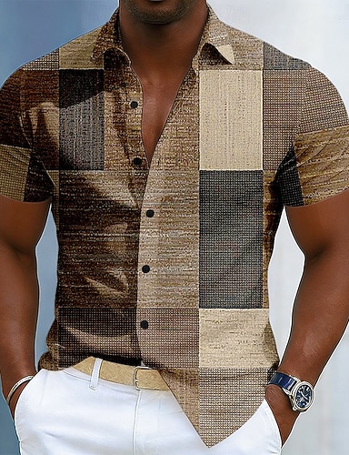 Miesten Geometrinen Väripalikka Tilkkutäkki Paita Button Up paita Lyhythihainen Muoti rento Päivittäin ulko- Loma Kesä Kevät Sänkyjen avaus 3D-tulostus Pellava kuin paita Sininen Ruskea Apila Harmaa