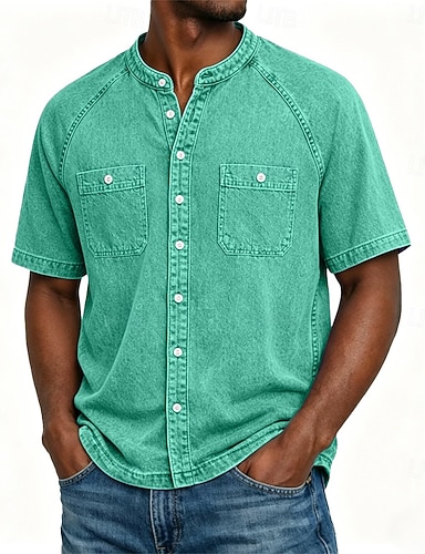 Miesten Paita Rento paita Button Up paita 100 % puuvillahappopesupaita Vaalean vihreä Purppura khaki Harmaa Vaalean sininen Lyhythihainen Tavallinen isoisän kaulus Kausaliteetti Päivittäin Tilkkutäkki