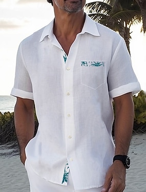 Miesten Kookospuu Pellava paita Kesä paita Button Up paita Lyhythihainen Muoti rento Loma Pyhäpäivä Ranta-asut Kesä Kevät Sänkyjen avaus kauluspaidat Edessä yksi tasku Valkoinen Apila