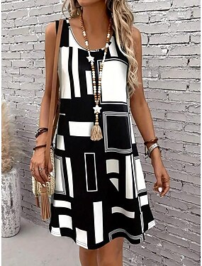 Naisten Mini mekko Kesämekko A linjainen mekko Loma Vapaa-aika Normaali Kuvitettu Geometrinen Abstrakti Hihaton U kaula-aukko Musta ja valkoinen Kesä Kevät