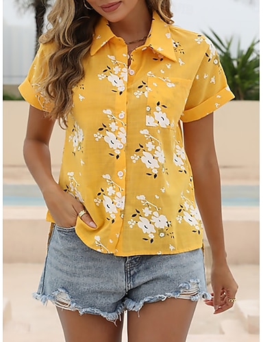 Naisten Paita Pusero Keinopuuvillainen pellava Tilkkutäkki Napit Painettu Kukka Kuvitettu Vintage Tyylikäs Klassinen Lyhythihainen Paitapuserokaula-aukko Tavalliset topit Päivittäin Pyhäpäivä Bile