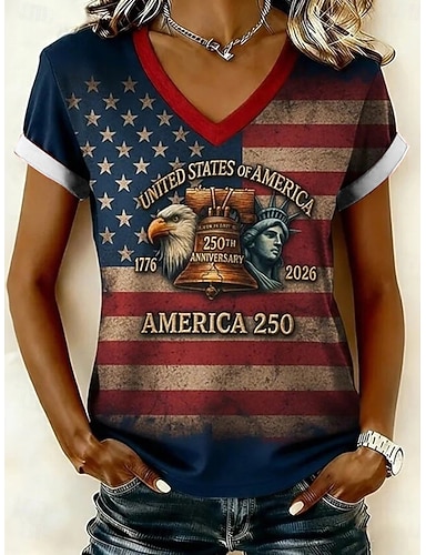 Amerikan itsenäisyyspäivä Naisten T-paita Painettu Kuvitettu Amerikan lippu Vintage Tyylikäs Klassinen Lyhythihainen V kaula-aukko Tavalliset topit Päivittäin Valkoinen Rubiini Kesä Kevät