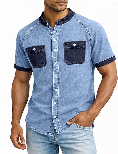 Miesten Demin paita 100 % puuvillahappopesupaita Henley toppi Lyhythihainen Vintage Ahdistunut Kausaliteetti Koti Katu Syystalvi Kesä Kevät Musta Vaaleanpunainen Vaalean vihreä Harmaa Vaalean sininen