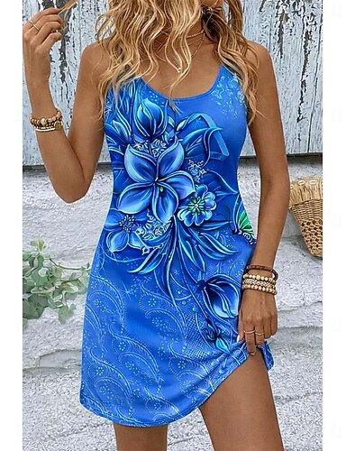 Naisten Mini mekko Kesämekko A linjainen mekko Loma Vapaa-aika Boheemi Hiekkaranta Juhla Häät Ohut Kukka Kuvitettu Hihaton U kaula-aukko Sininen Keltainen Punastuvan vaaleanpunainen Rubiini Kesä Kevät