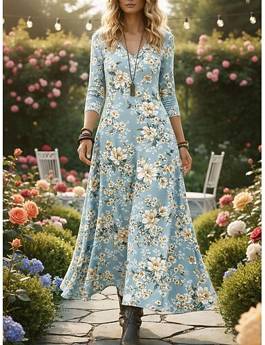 Naisten Maksimekko A linjainen mekko Vapaa-aika Päivittäin Häät Deitti Loose Fit Kukka Kuvitettu 3/4 hiha Tiukka pyöreä kaula-aukko Sininen Vaalean vihreä Purppura Apila Kesä Kevät