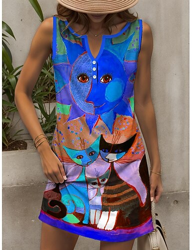 Naisten Mini mekko Kesämekko Väljä mekko Olkapäältä pois menevä mekko Loma Vapaa-aika ulko- Bile Normaali Kuvitettu Eläin Kissa Hihaton V kaula-aukko Sininen Keltainen Rubiini Purppura Kesä Kevät