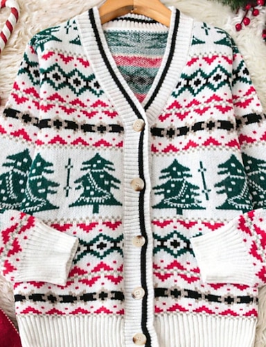 Naisten Neule Vapaa-aika Joulukuusi Joustin V kaula-aukko Napit Kudottu Painettu Pitkähihainen Tavalliset topit Neuloa Joulu Päivittäin Bile Valkoinen Talvi