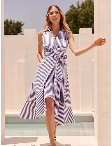 Naisten Resort Wear Tyylikäs mekko Maksimekko Sininen Lyhythihainen Raita solmio edessä Raita Tulostus Kevät kesä Cross-front-pääntie Tyylikäs Loma loma mekko S M L