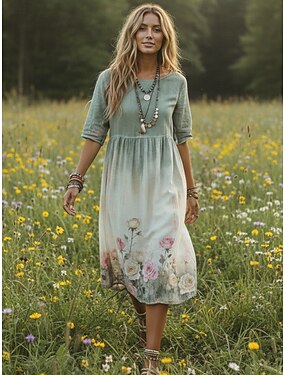 Naisten Midimekko Keinopuuvillainen pellava Boho-mekko Väljä mekko Rento mekko Vintage Päivittäin ulko- Hiekkaranta Loose Fit Kukka Puolihiha Tiukka pyöreä kaula-aukko Apila Kesä Kevät