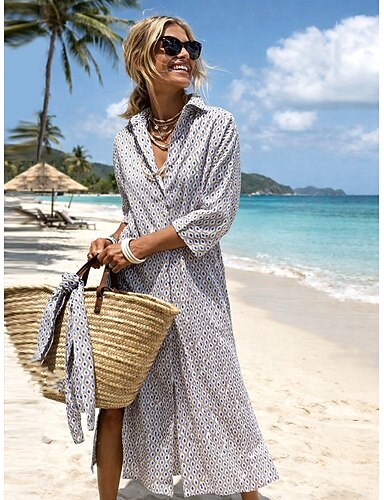 Naisten Maksimekko Kesämekko A linjainen mekko Loma Vapaa-aika Boheemi Hiekkaranta Bile Loose Fit Kukka Kuvitettu Geometrinen Lyhythihainen V kaula-aukko Sininen Vaalean ruskea Taivaan sininen Harmaa