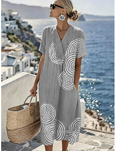 Naisten elegantti juhlapuku midi pyöreä kaula-aukko lyhyet hihat rento mekko siirtopuku kesämekko vintage työ rento löysä istuvuus geometrinen harmaa kesä
