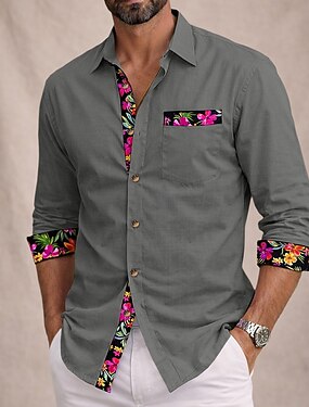 Miesten Paita Pellava paita Kesä paita Ranta-asut Button Up paita Kukka Kausaliteetti Päivittäin Sininen Musta Valkoinen Punastuvan vaaleanpunainen Pitkähihainen Kauluskäänne Kesä Kevät Vaatetus