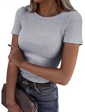 Naisten Neulo T-paita Joustava vyötärö Joustin Yhtenäinen väri Vintage Tyylikäs Vapaa-aika Lyhythihainen Tiukka pyöreä kaula-aukko Tavalliset topit Päivittäin Bile Musta Harmaa Kesä Kevät Syksy