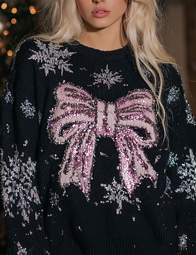 Naisten Neulos Pusero Vapaa-aika Joulu poro Joustin Tiukka pyöreä kaula-aukko Kudottu Painettu Pitkähihainen Tavalliset topit Neuloa Joulu Päivittäin Pyhäpäivä Musta Talvi