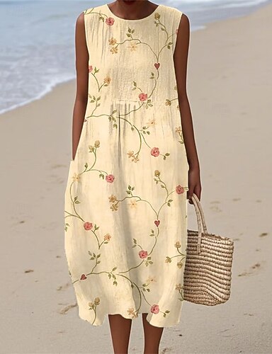 Naisten Midimekko Rento mekko Kesämekko Muoti Moderni Päivittäin Hiekkaranta Viikonloppu Normaali Kukka Hihaton Tiukka pyöreä kaula-aukko Valkoinen Keltainen Syksy